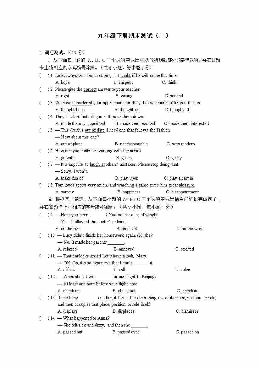 期末测试2 上海牛津版九年级英语下册(含答案)