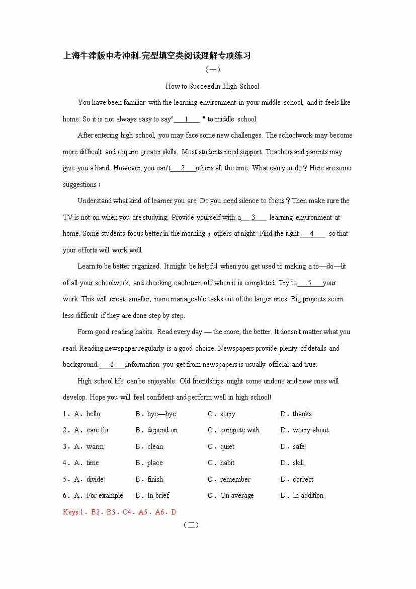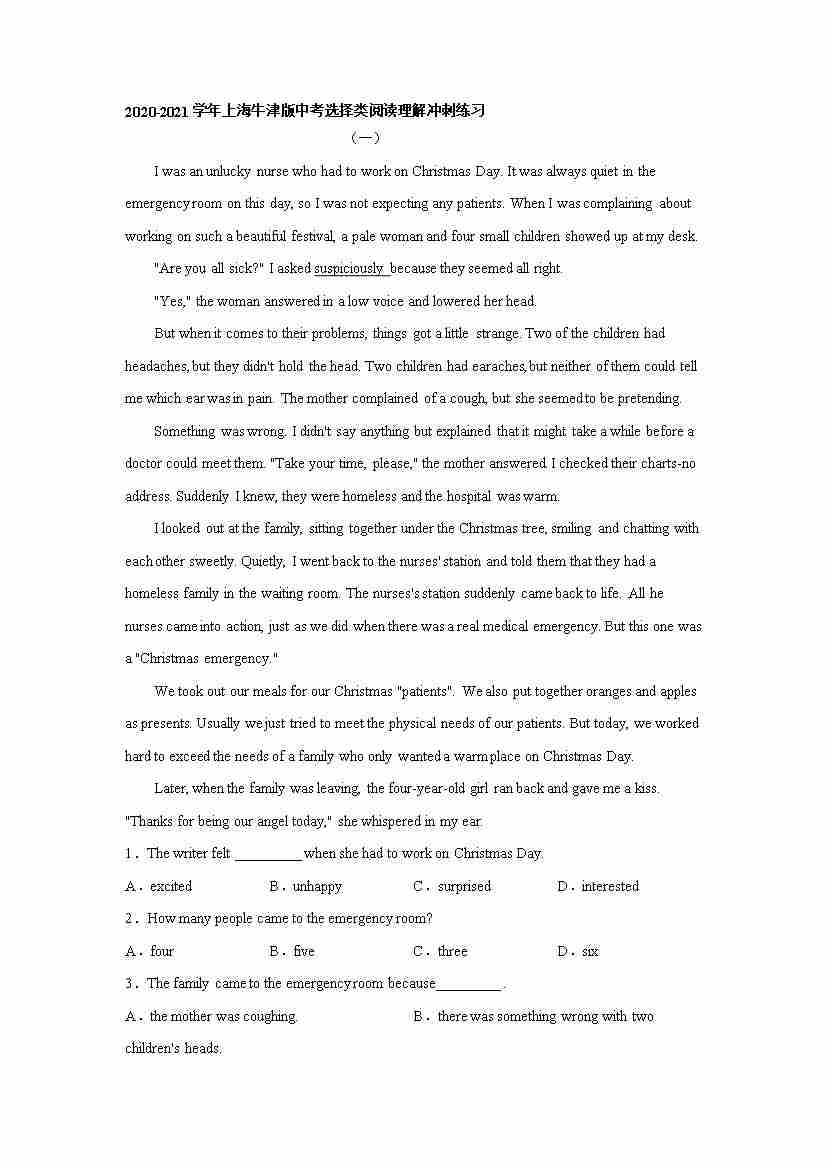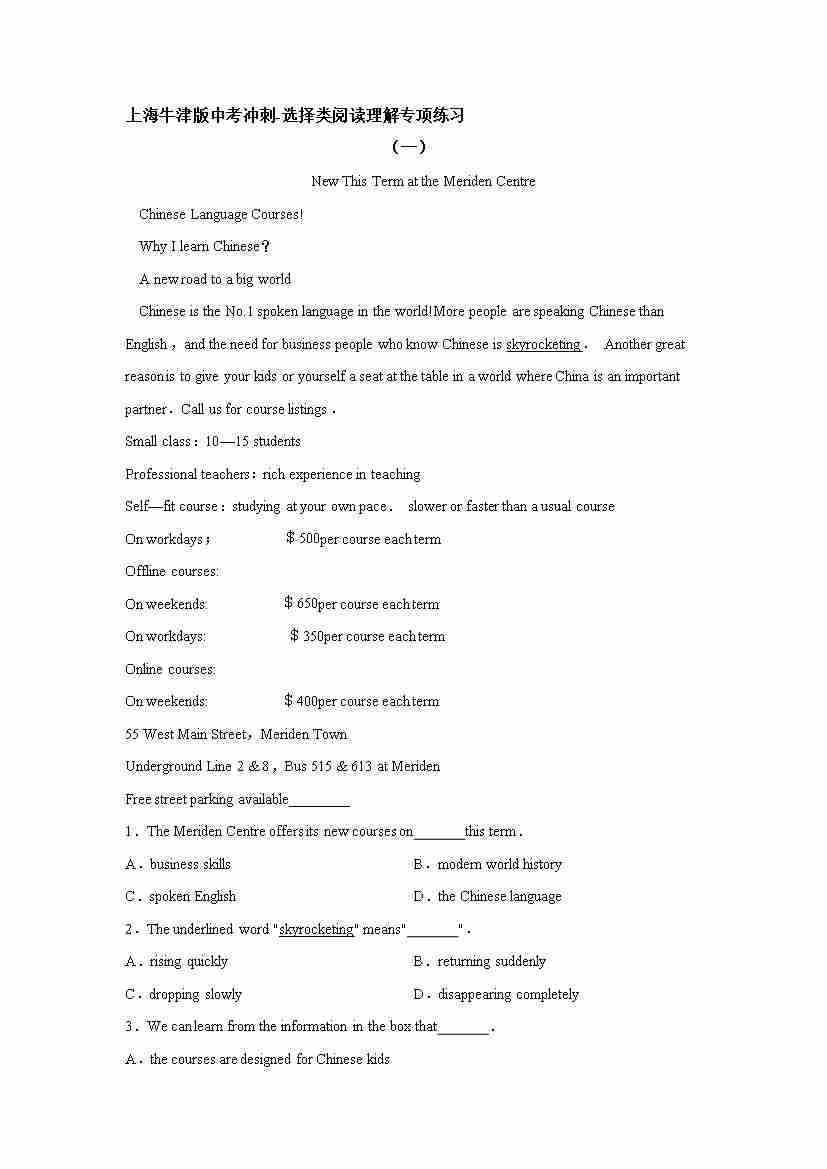 上海牛津版中考选择类阅读理解冲刺练习(有答案)