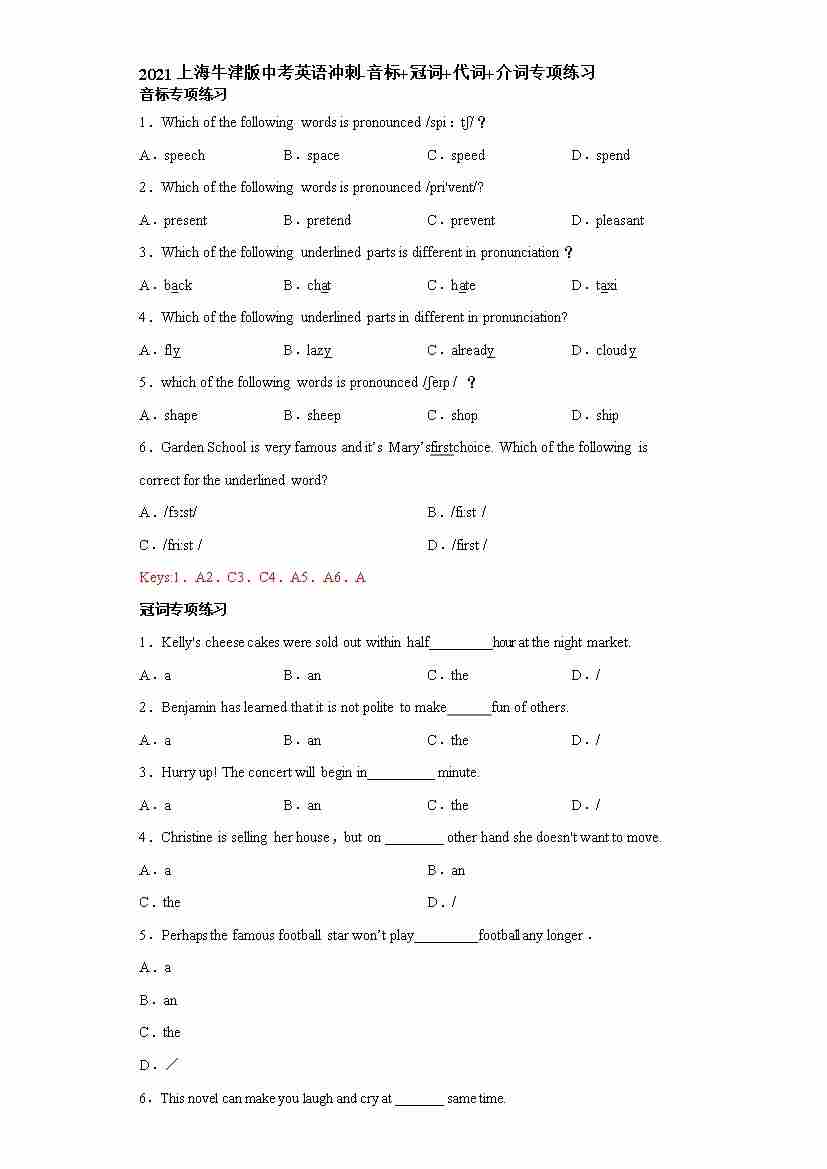 上海牛津版中考冲刺-语法专项练习(有答案)