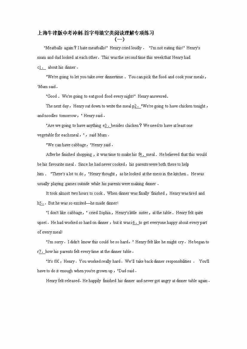 上海牛津版中考冲刺-首字母填空类阅读理解专项练习(有答案)