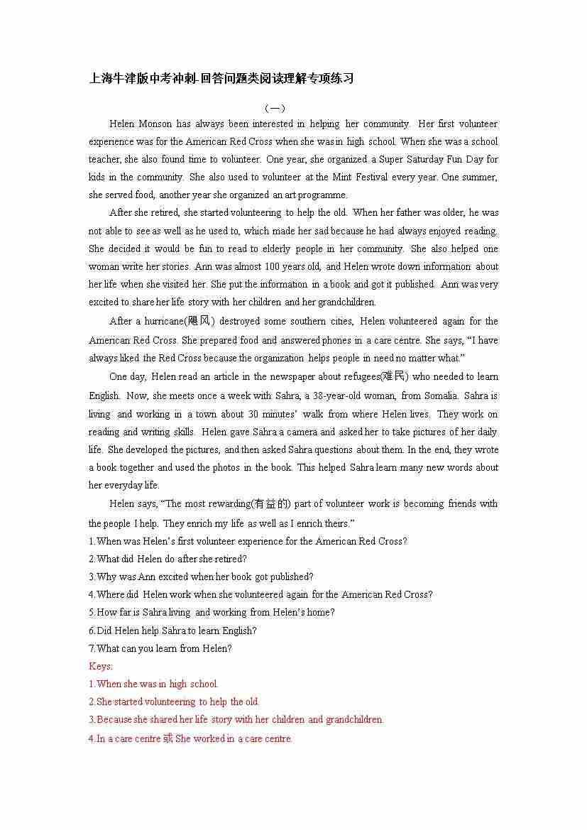 上海牛津版英语中考冲刺-回答问题类阅读理解专项练习(有答案)