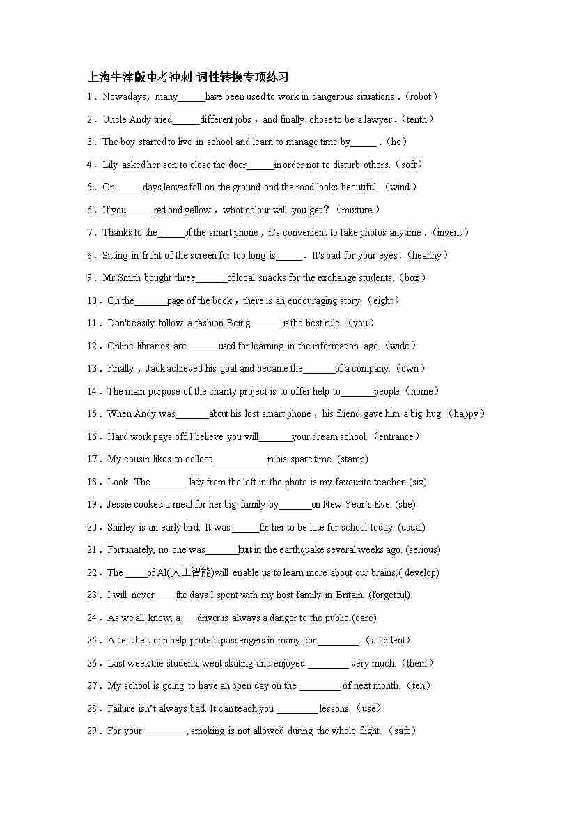 上海牛津版英语中考冲刺-词性转换专项练习(有答案)