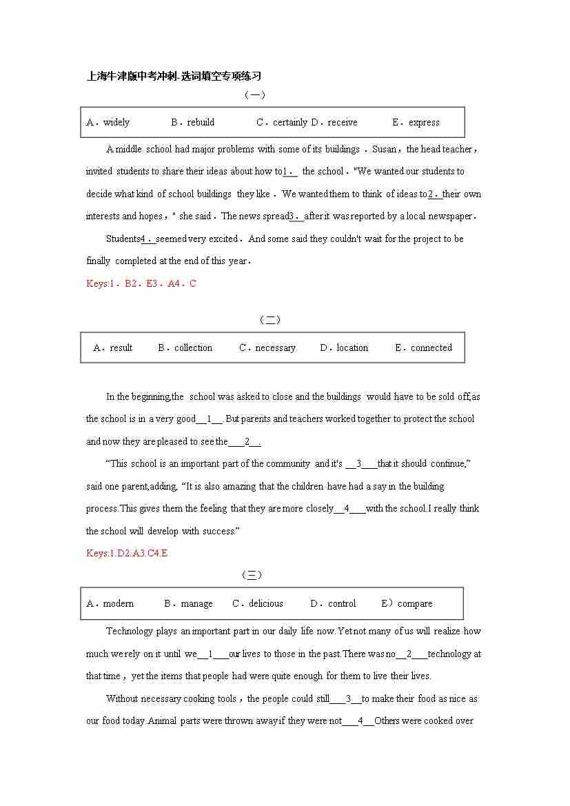 上海牛津版英语中考冲刺-选词填空专项练习(有答案)