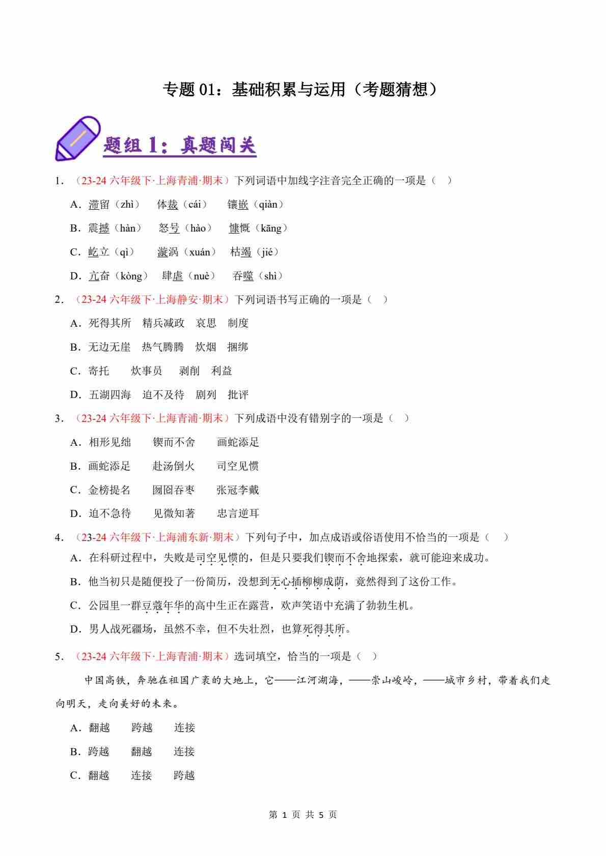 专题01:基础积累与运用(考题猜想)(原卷版)