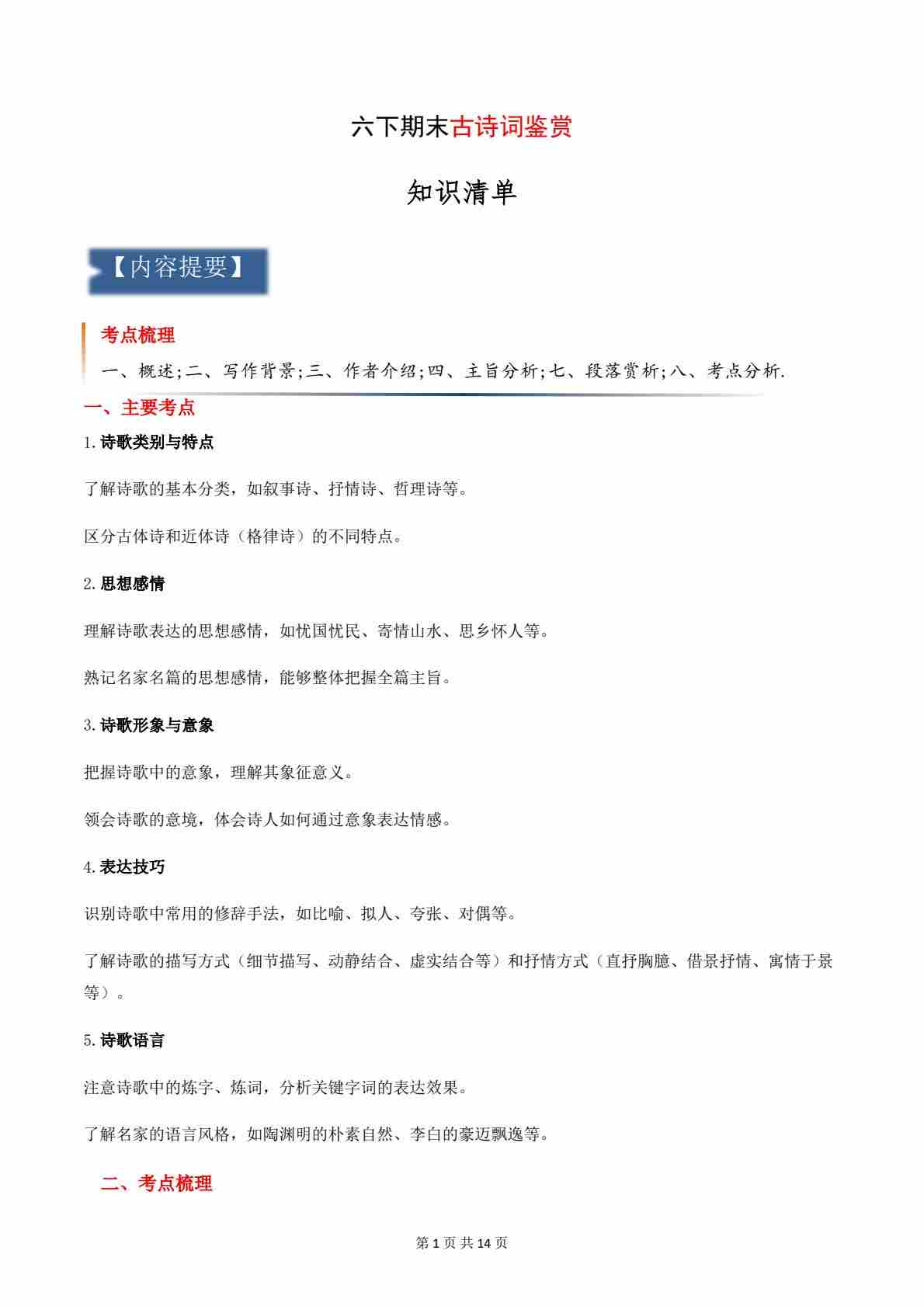 专题02:古诗词鉴赏(知识清单)