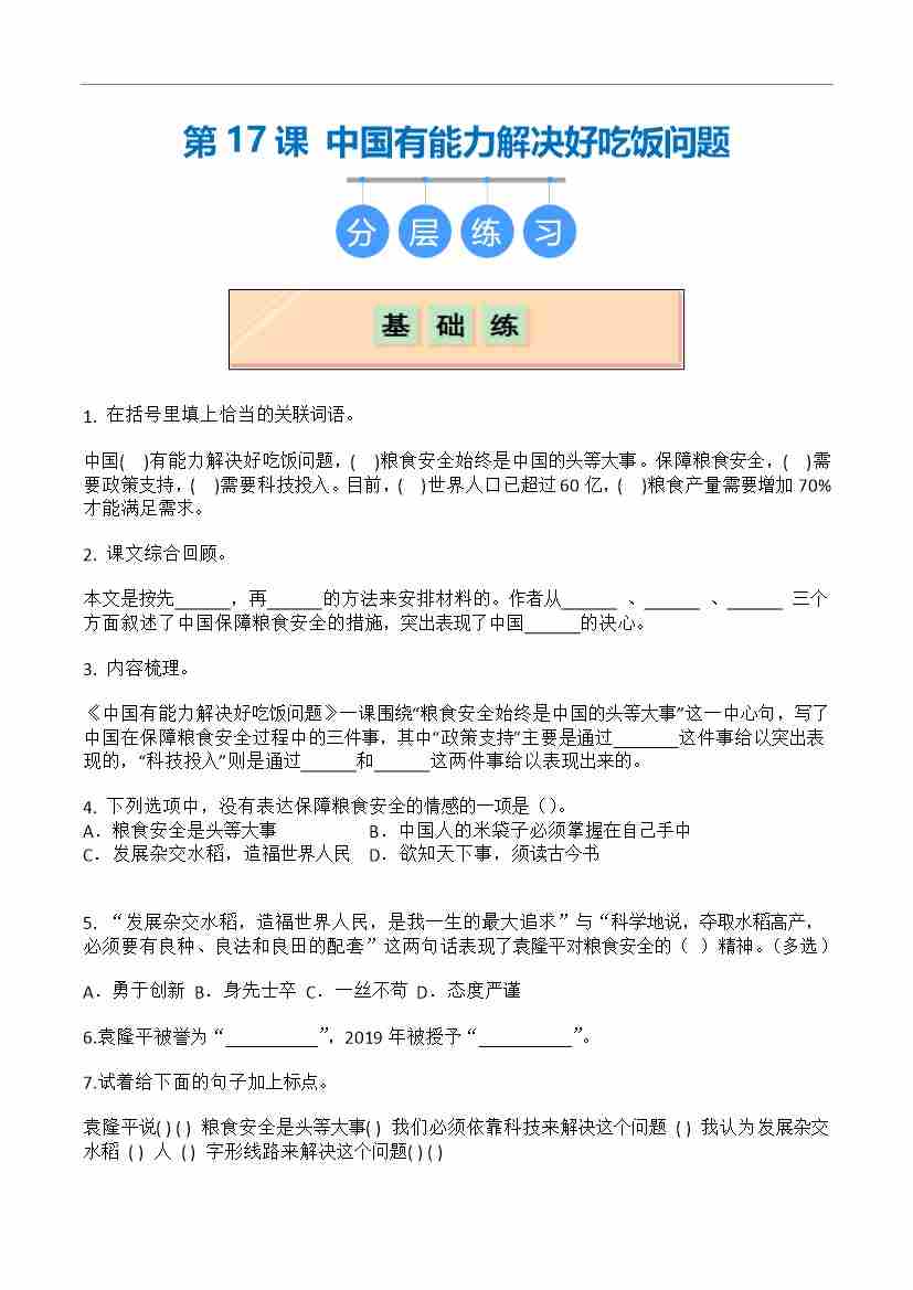 第17课《中国有能力解决好吃饭问题》(分层练习)原卷版