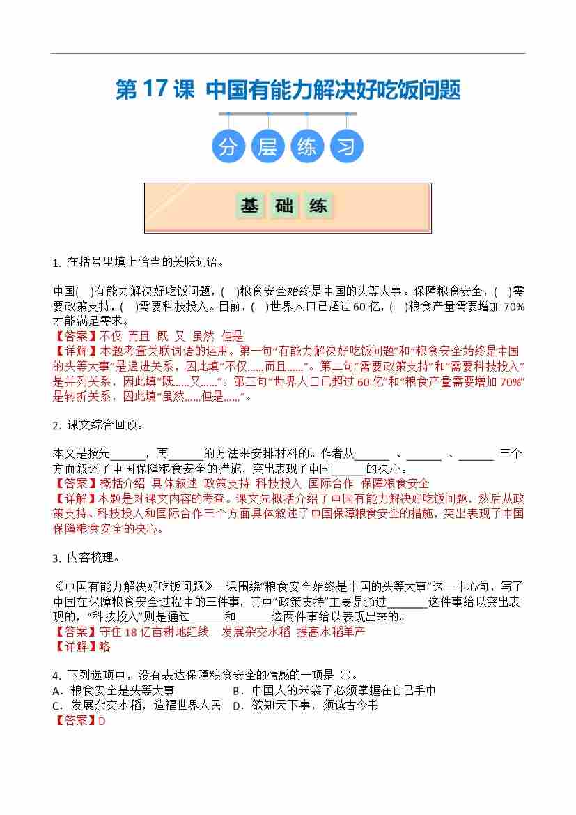 第17课《中国有能力解决好吃饭问题》(分层练习)解析版