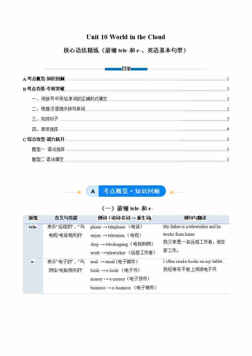 Unit 10 World in the Cloud 前缀tele-和e-、英语基本句型(单元核心语法精练)(解析版)