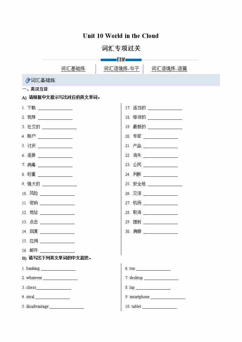 Unit 10 World in the Cloud 单词短语句型语法(教材考点精练)(原卷版)