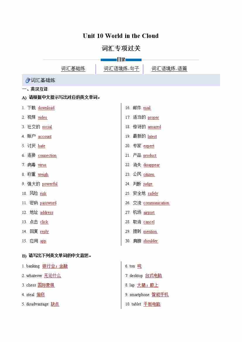 Unit 10 World in the Cloud(重难词汇精练)(解析版)