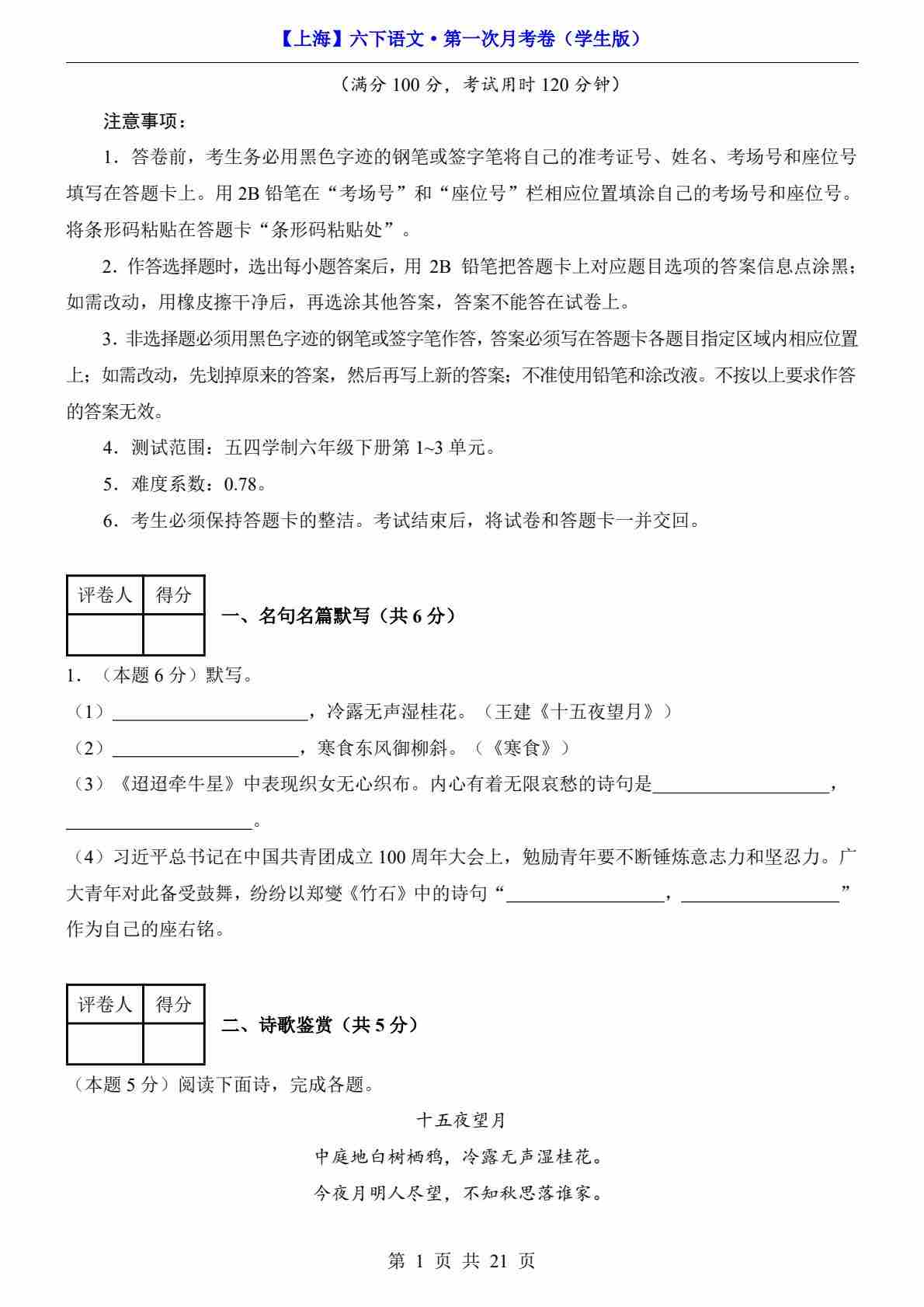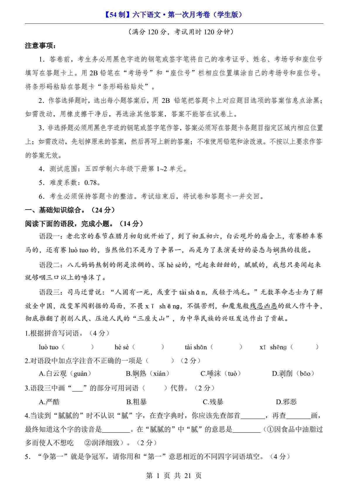 【上海】6下语文第1次月考【第1-3单元】