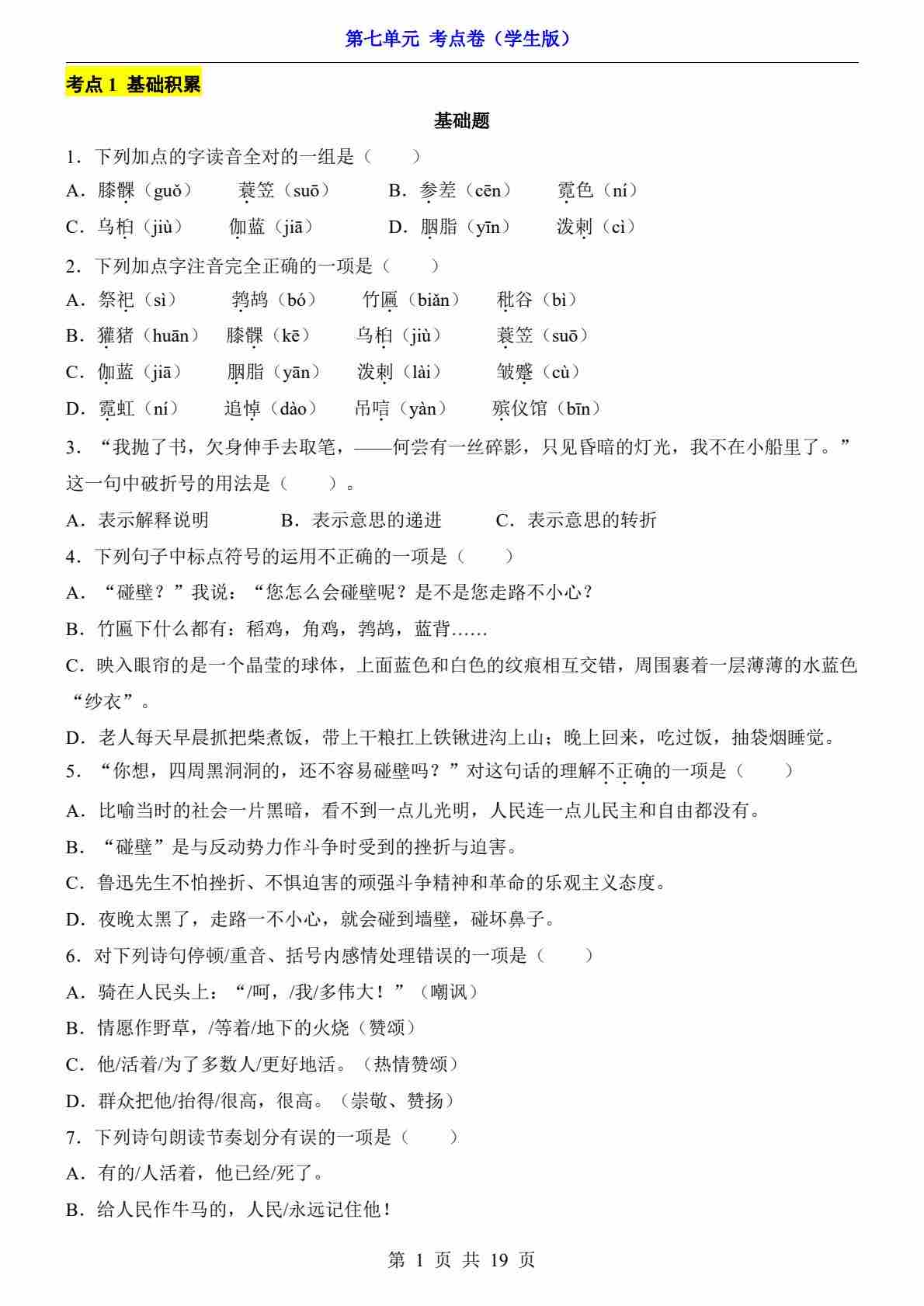 六下语文五四制第7单元(考点卷)