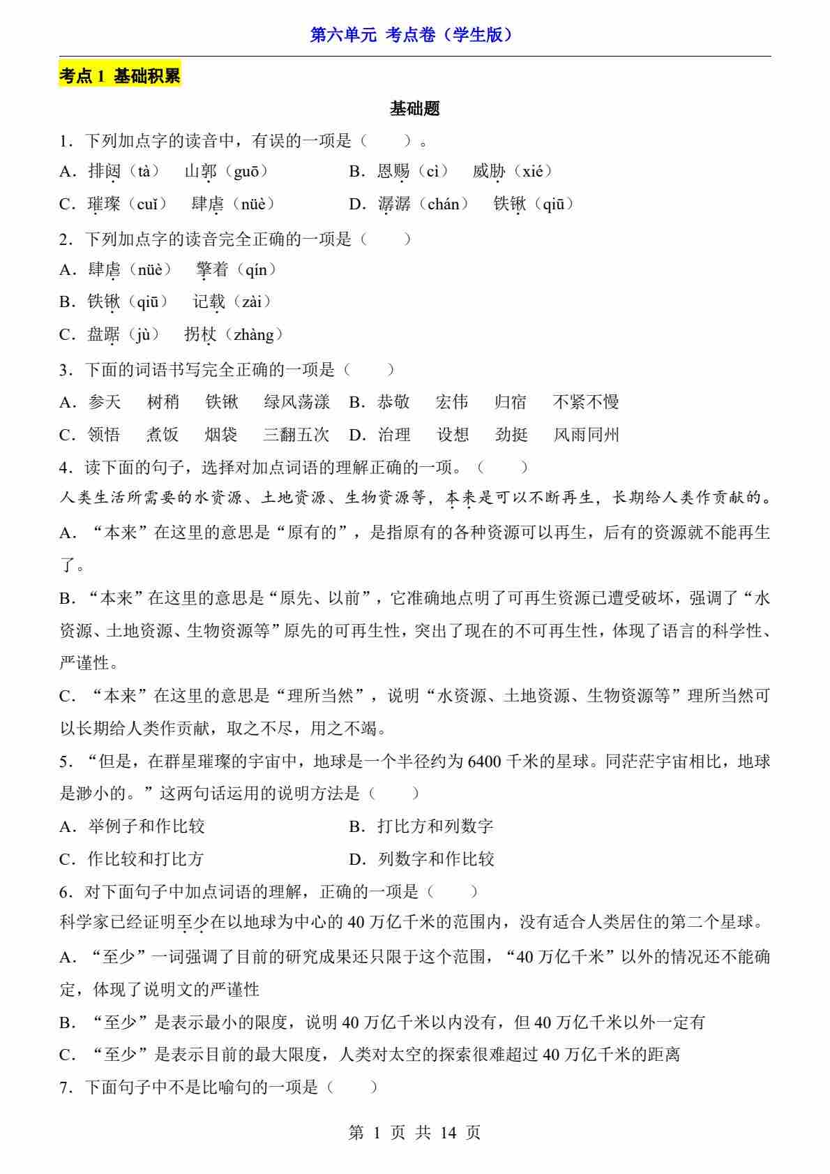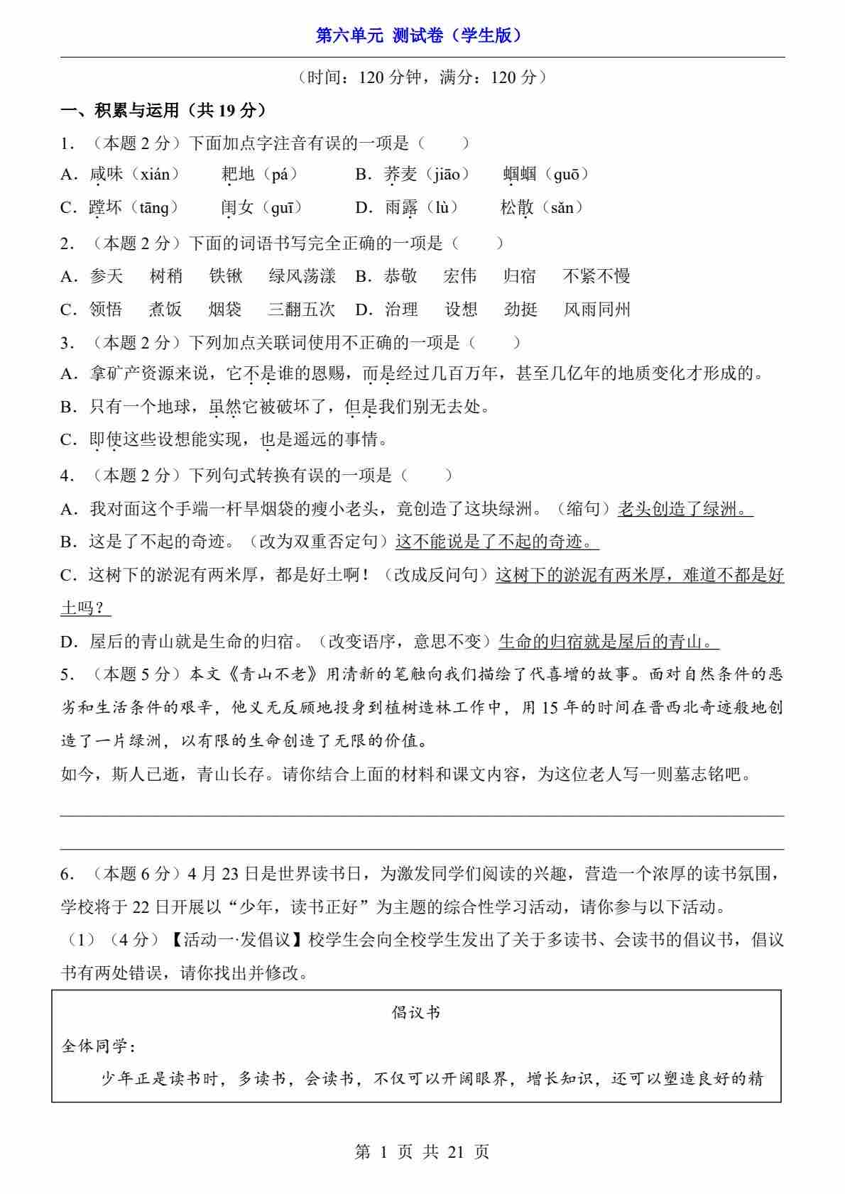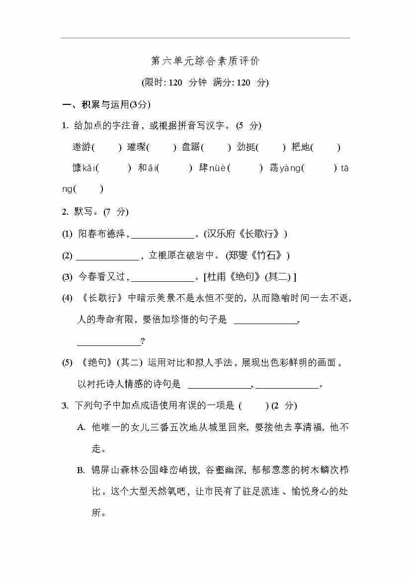 第6单元综合素质评价卷(含答案)人教版(五四制)