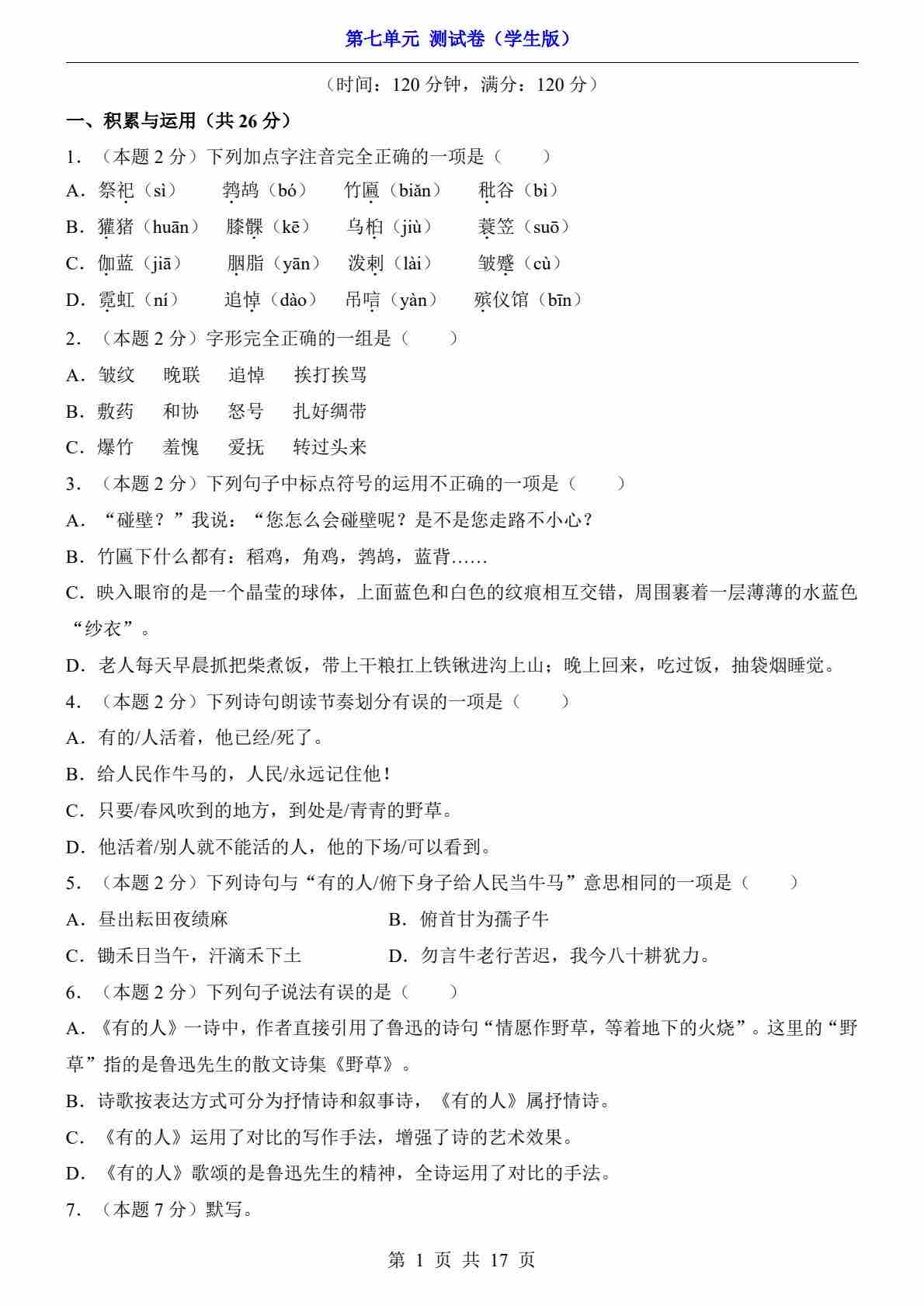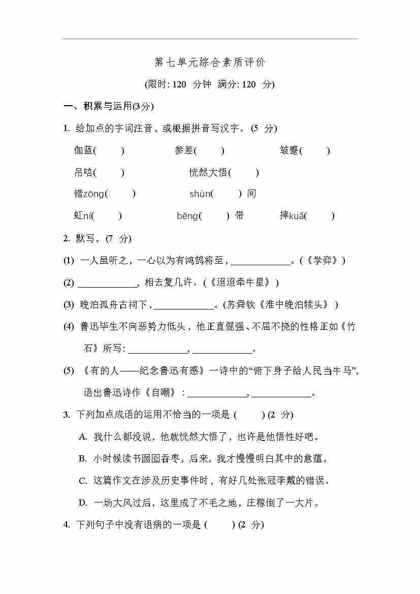 第7单元综合素质评价卷(含答案)人教版(五四制)