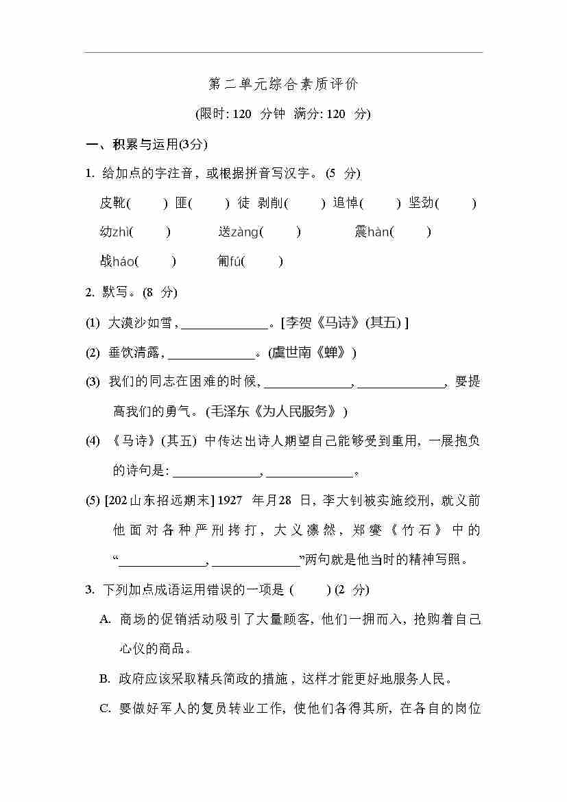 第2单元综合素质评价卷(含答案)人教版(五四制)