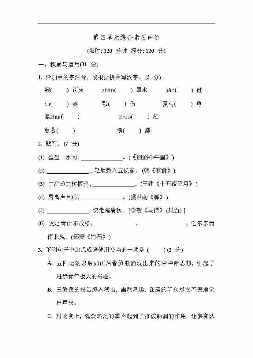 第4单元综合素质评价卷(含答案)人教版(五四制)