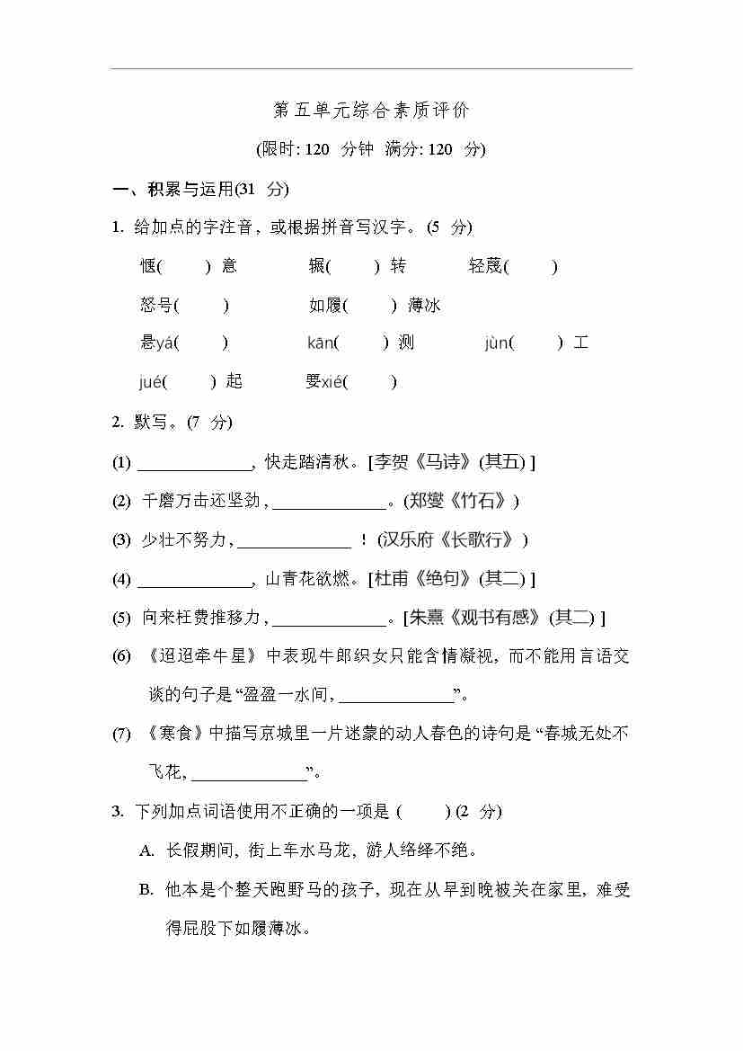 第5单元综合素质评价卷(含答案)人教版(五四制)