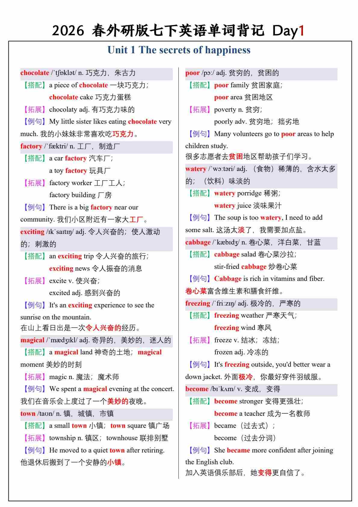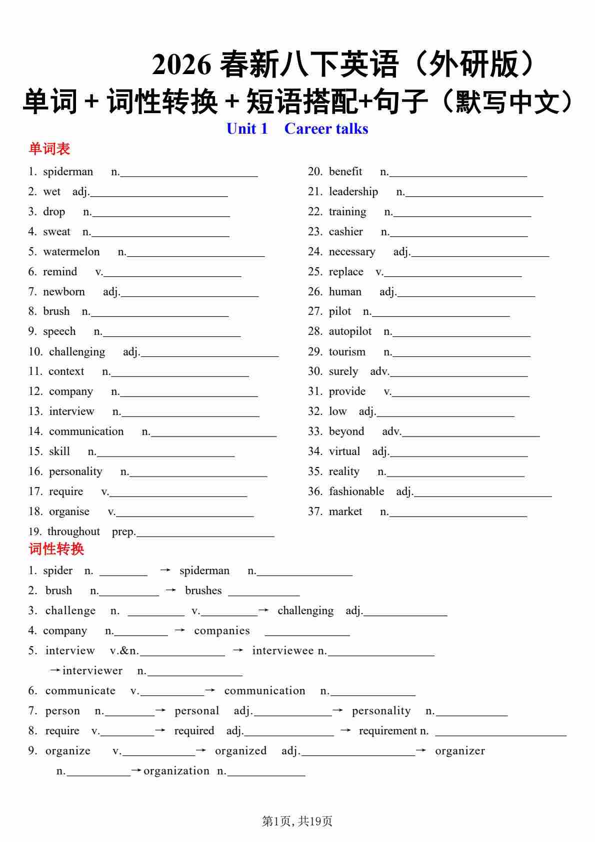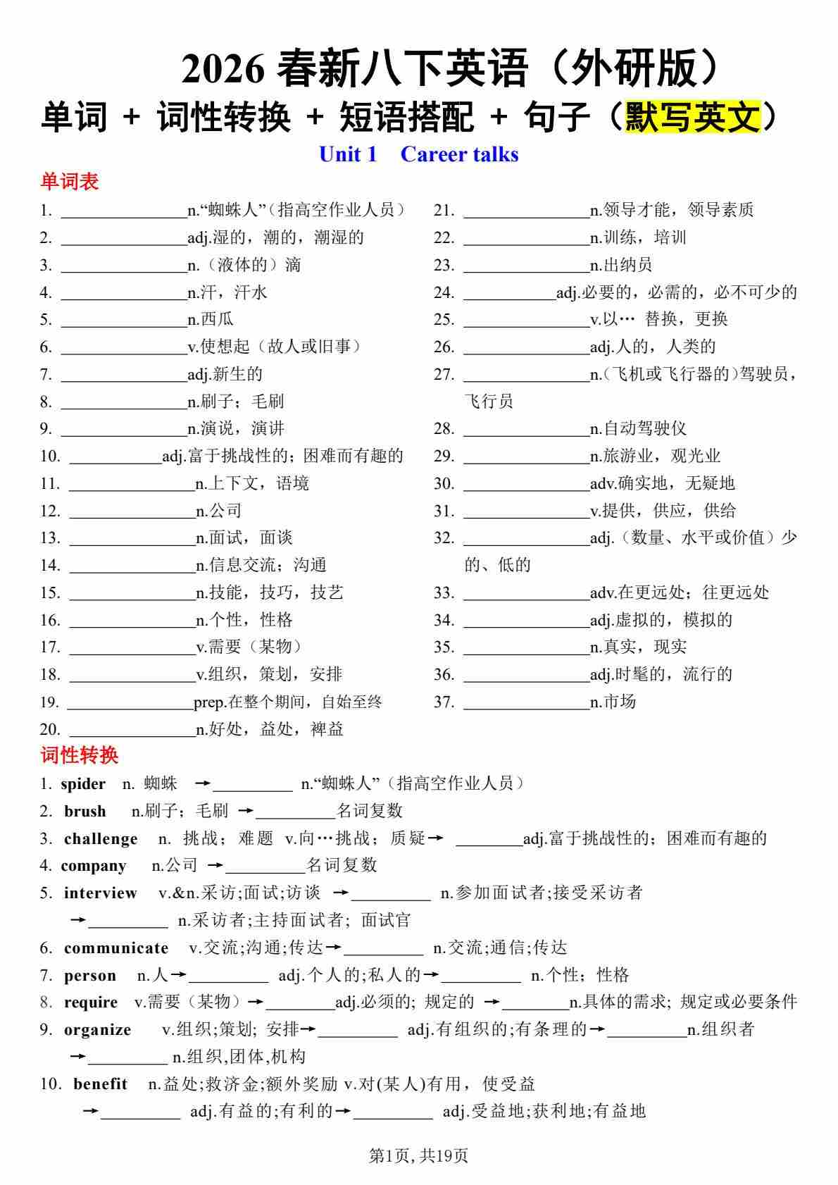2026春外研版新八下单词表词性转换短语句子 (默写中文)