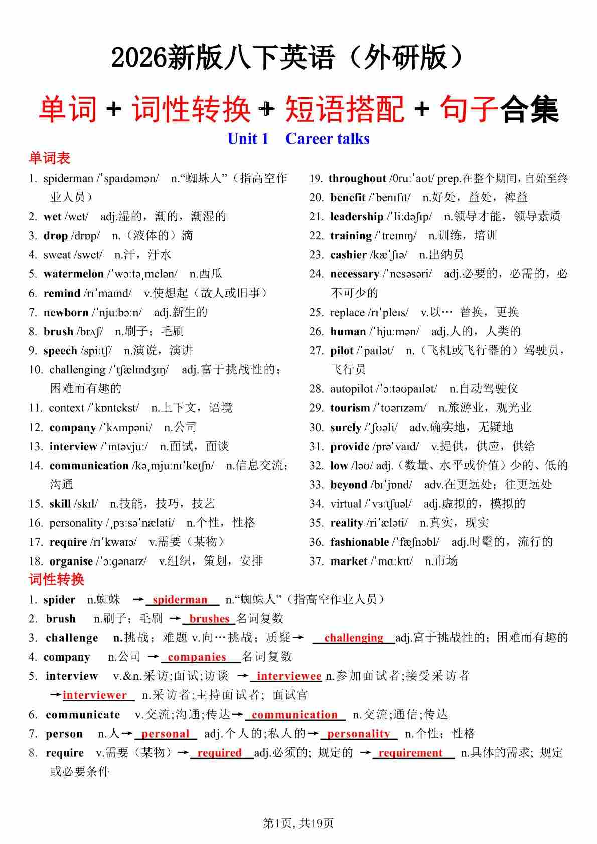 2026春外研版新八下重点单词词性转换短语句子 (默写英文)