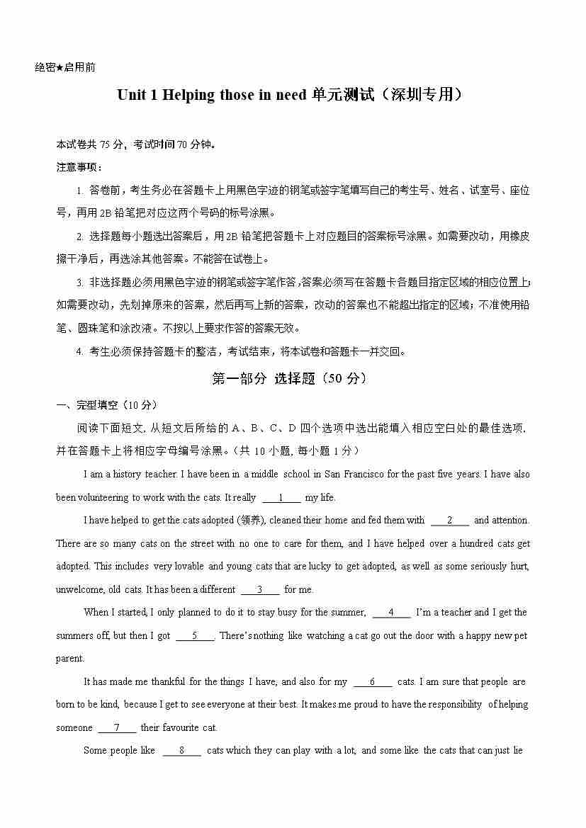 Unit 1 Helping those in need 单元测试(深圳专用)(解析版)