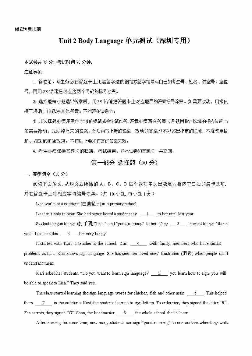 Unit 2 Body Language 单元测试(深圳专用)(解析版)