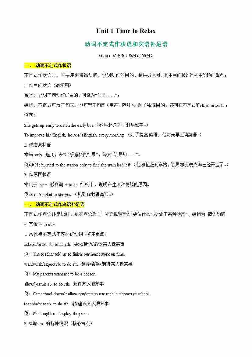 Unit 1 Time to Relax 单元语法grammar 动词不定式作状语和宾语补足语(解析版)