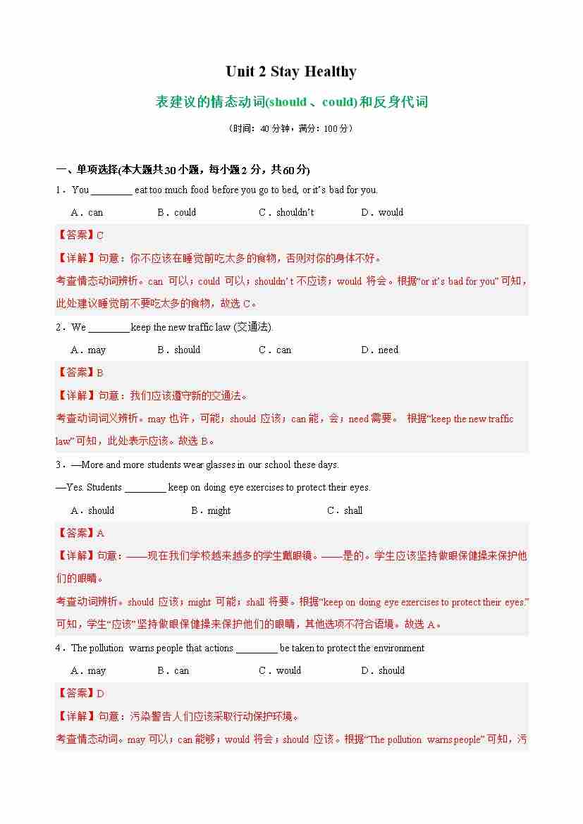 Unit 2 Stay Healthy 单元语法(表建议的情态动词(should、could)和反身代词)(解析版)