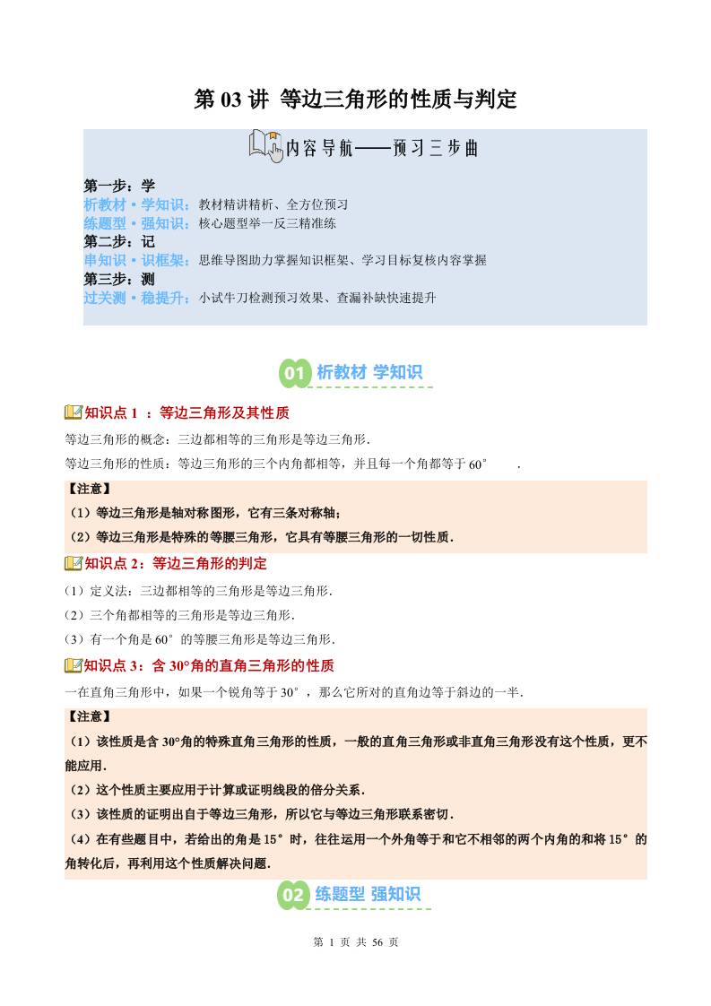 第03讲 等边三角形的性质与判定(3知识点8大题型过关测)(寒假预习讲义)(原卷版)八年级数学新教材北师大版