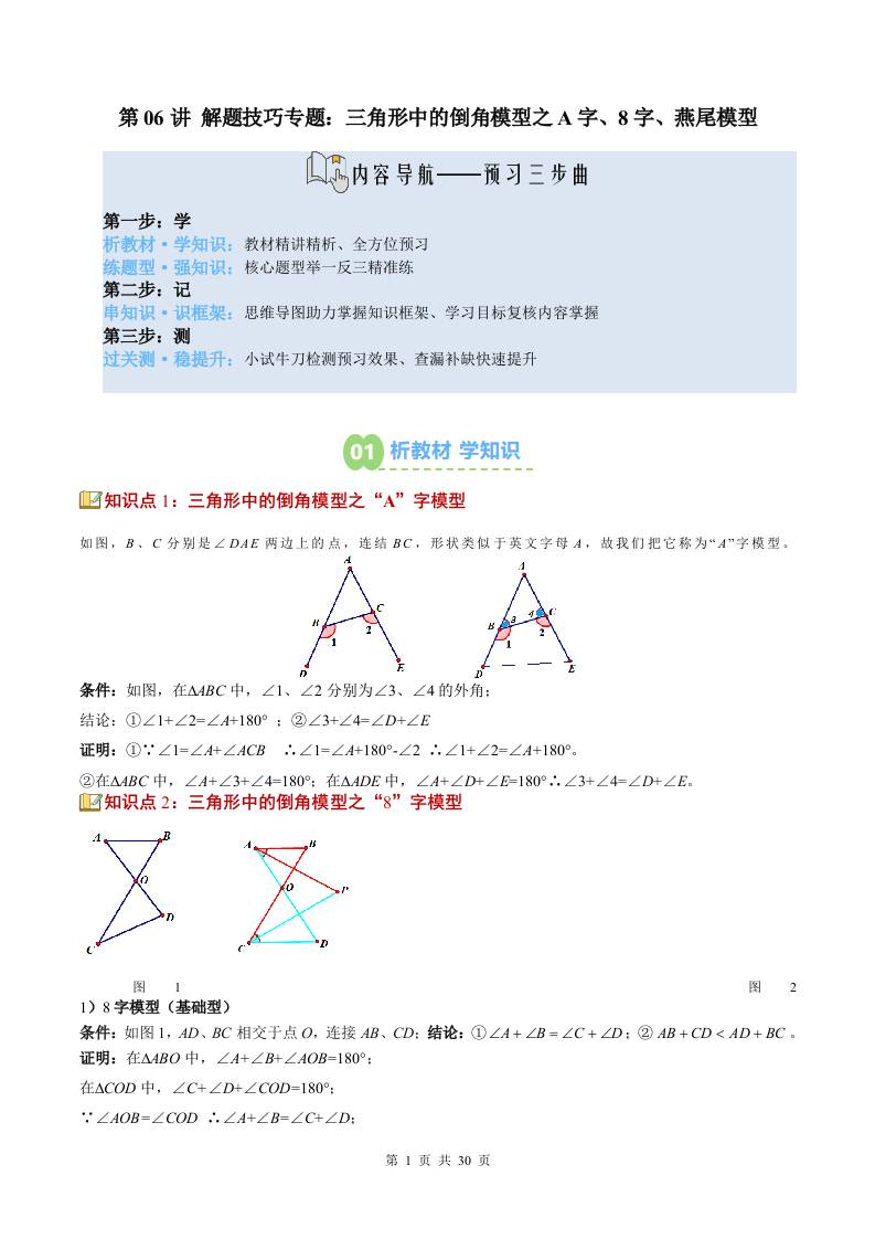 第06讲 解题技巧专题:三角形中的倒角模型之A字、8字、燕尾模型(3知识点3大题型过关测)(寒假预习讲义)(原卷版)八年级数学新教材北师大版
