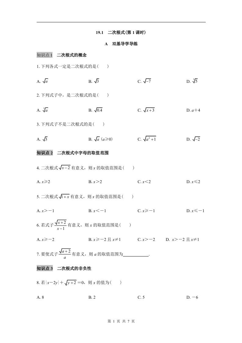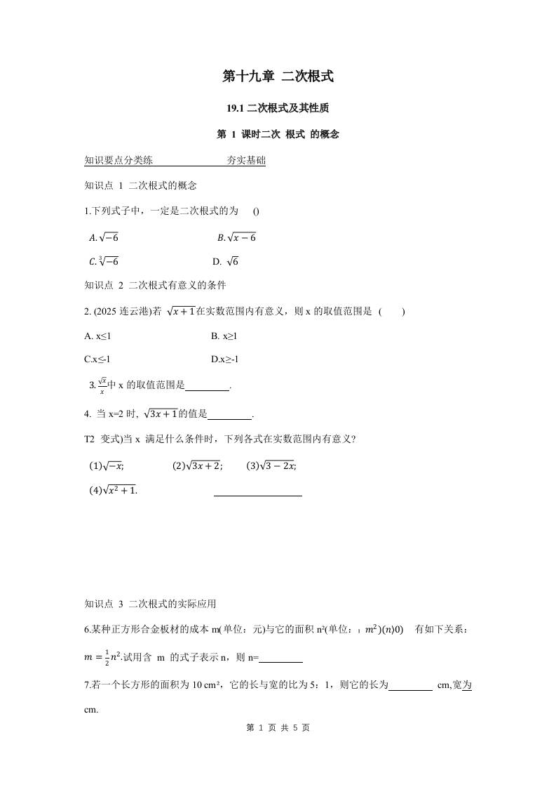 19.1二次根式及其性质 同步练习 2025-2026学年人教版数学八年级下册