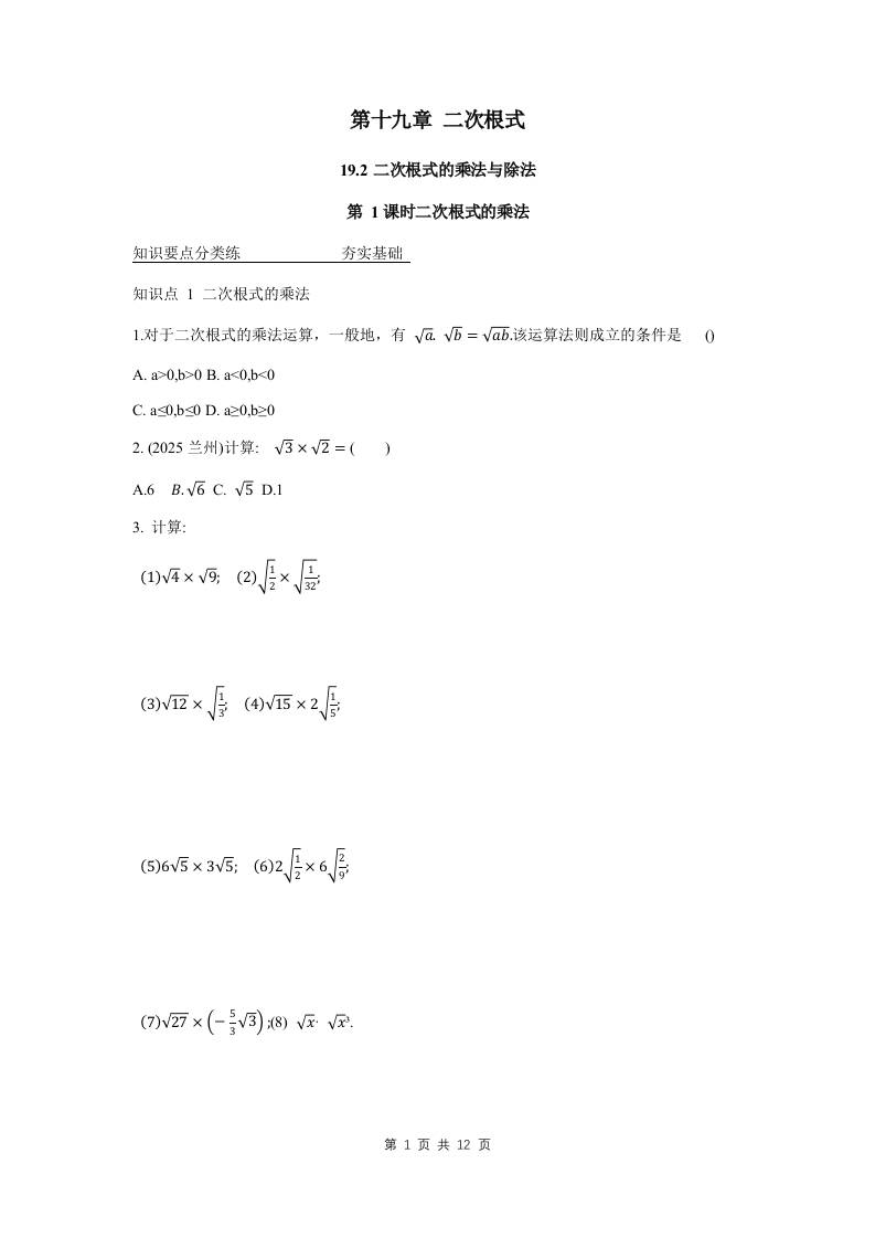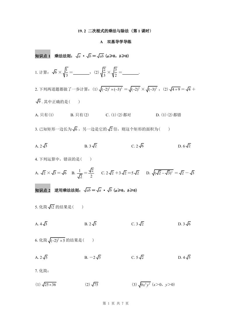 19.2二次根式的乘法与除法 同步练习 -2025-2026学年人教版数学八年级下册