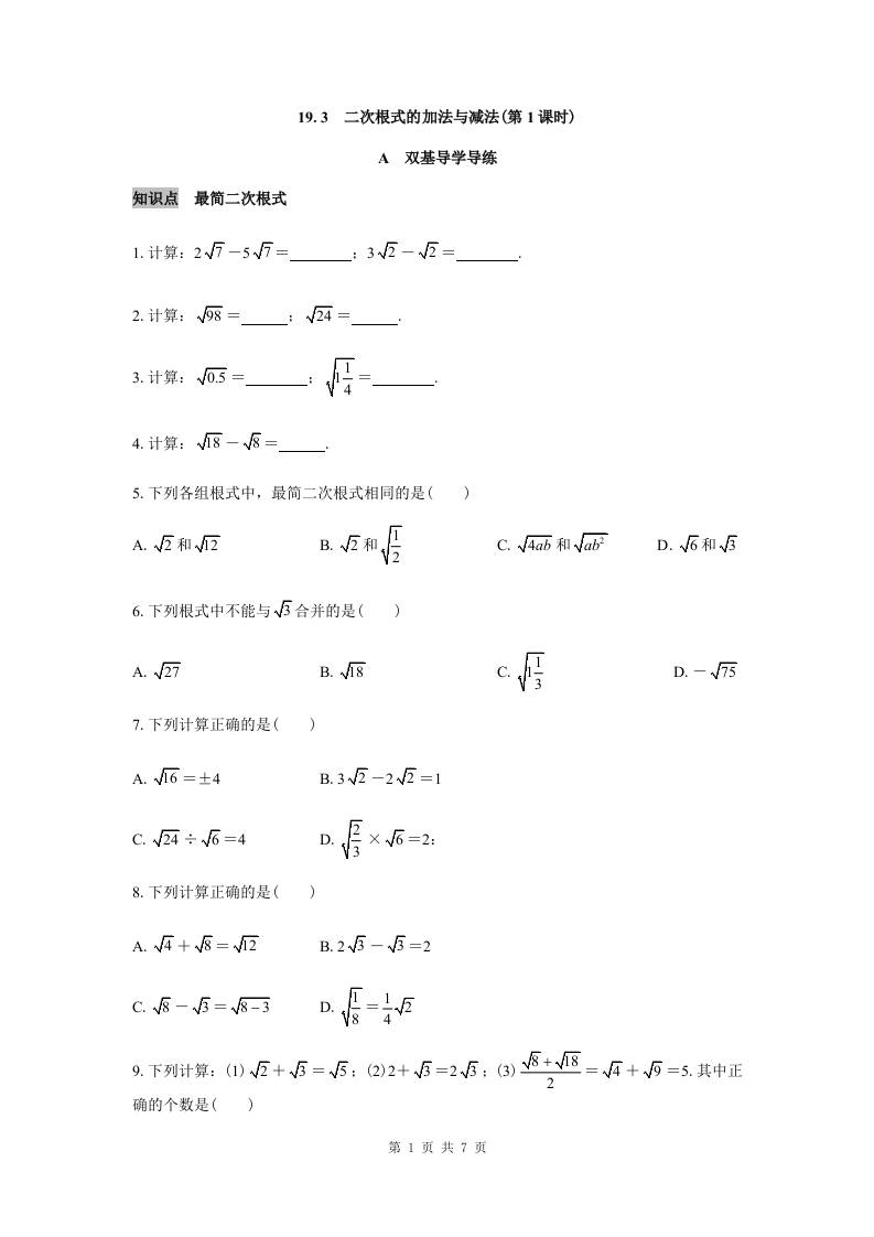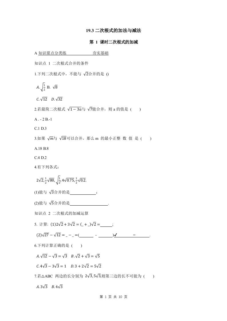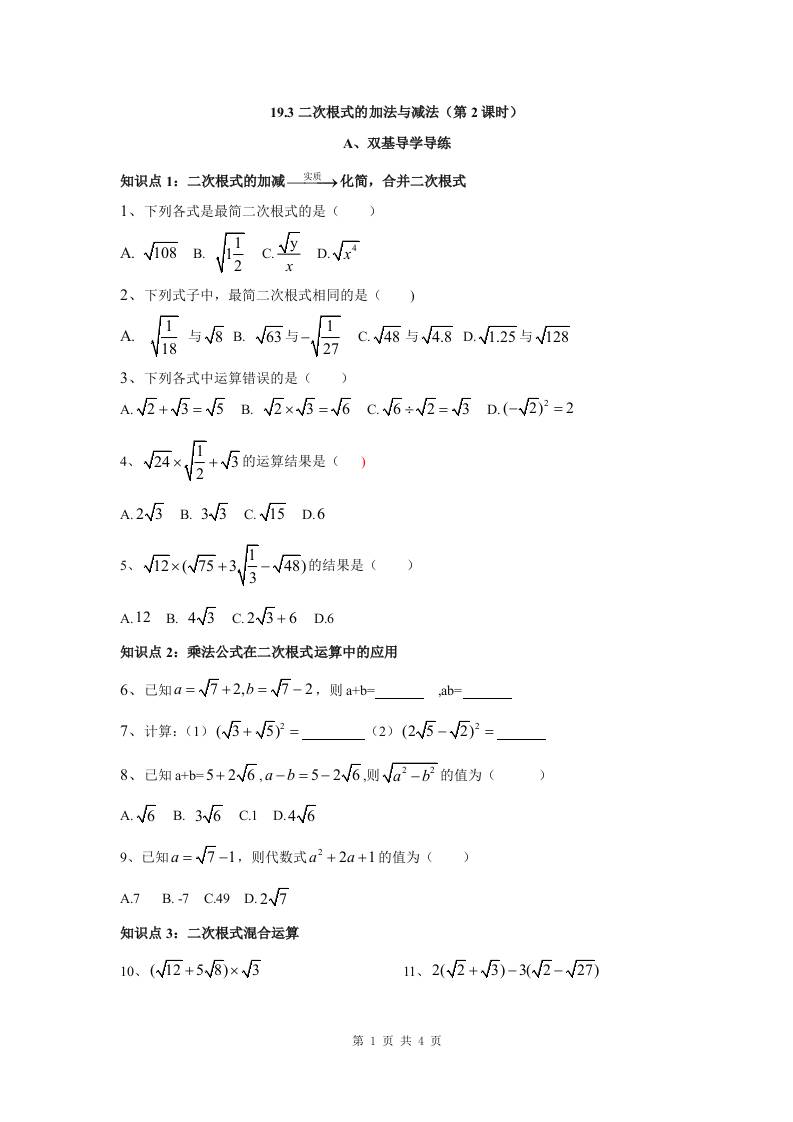 19.3 二次根式的加法与减法(第2课时) 知识点导学导练 2025-2026学年人教版数学八年级下册
