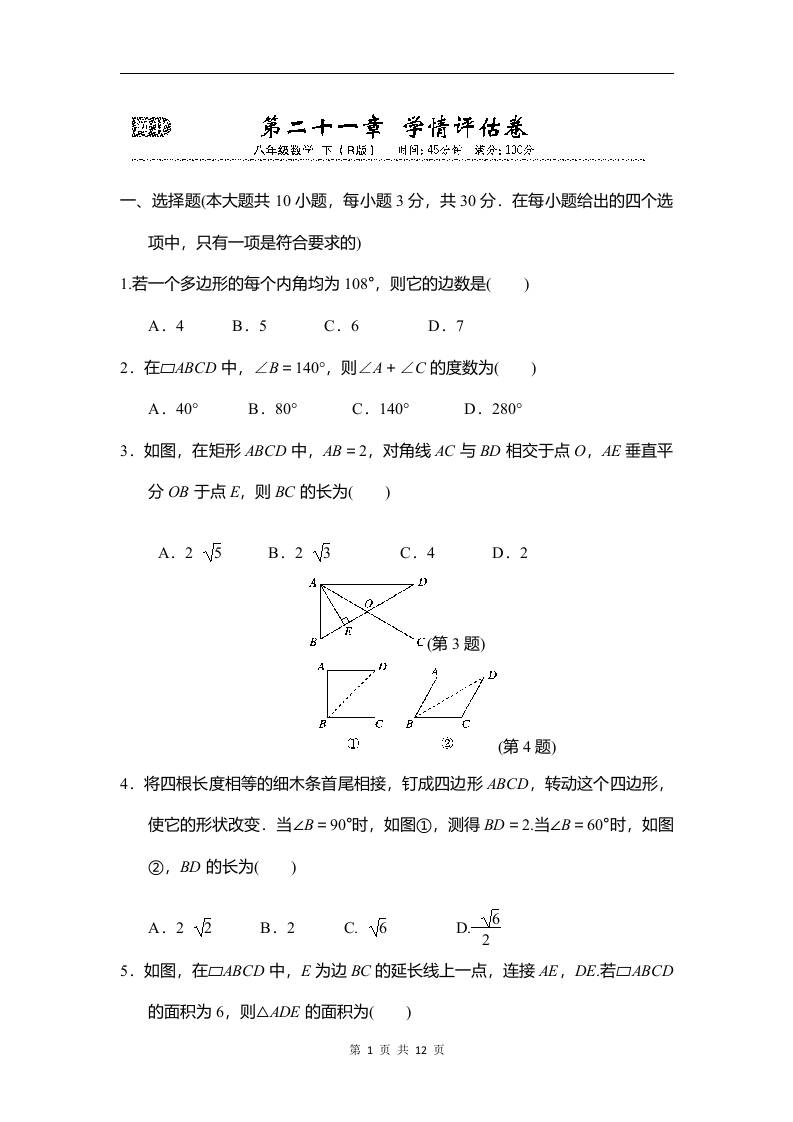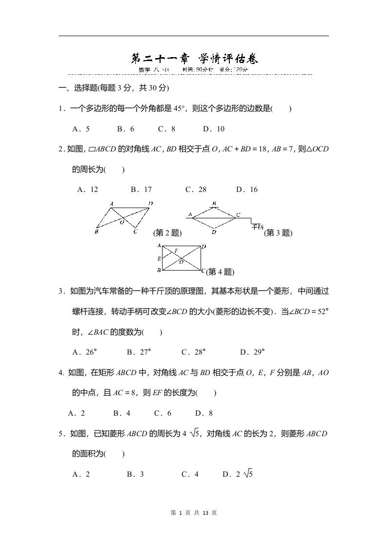 第二十一章 四边形 学情评估卷 2025-2026学年新人教版数学八年级下册
