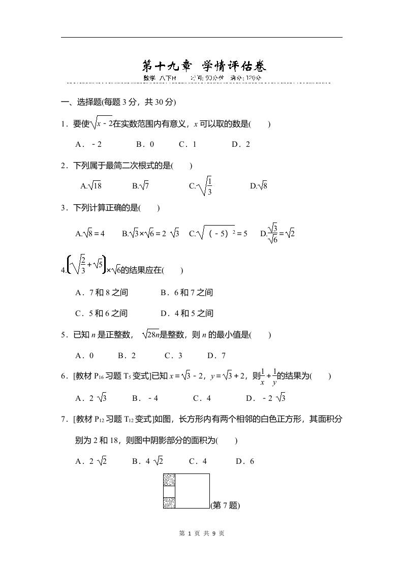 第十九章 二次根式 学情评估卷 2025-2026学年 人教版数学(2024) 八年级下册