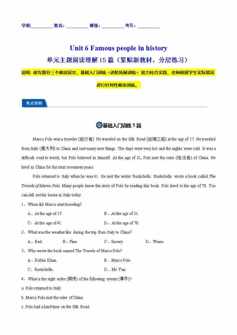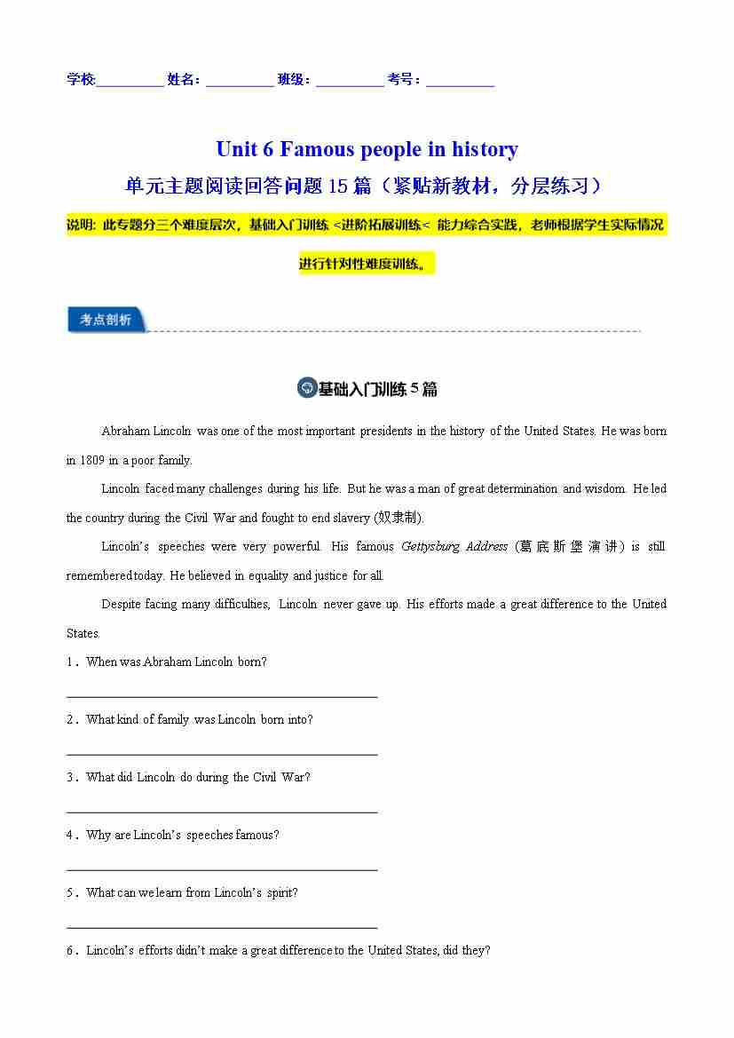 Unit 6 Famous people in history 单元主题阅读回答问题15篇(紧贴新教材,分层练习)(原卷版)