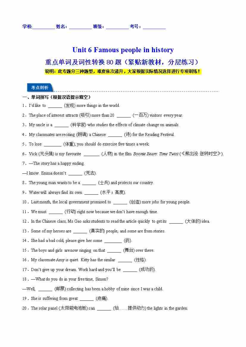 Unit 6 Famous people in history 重点单词及词性转换80题(紧贴新教材,分层练习)(原卷版)