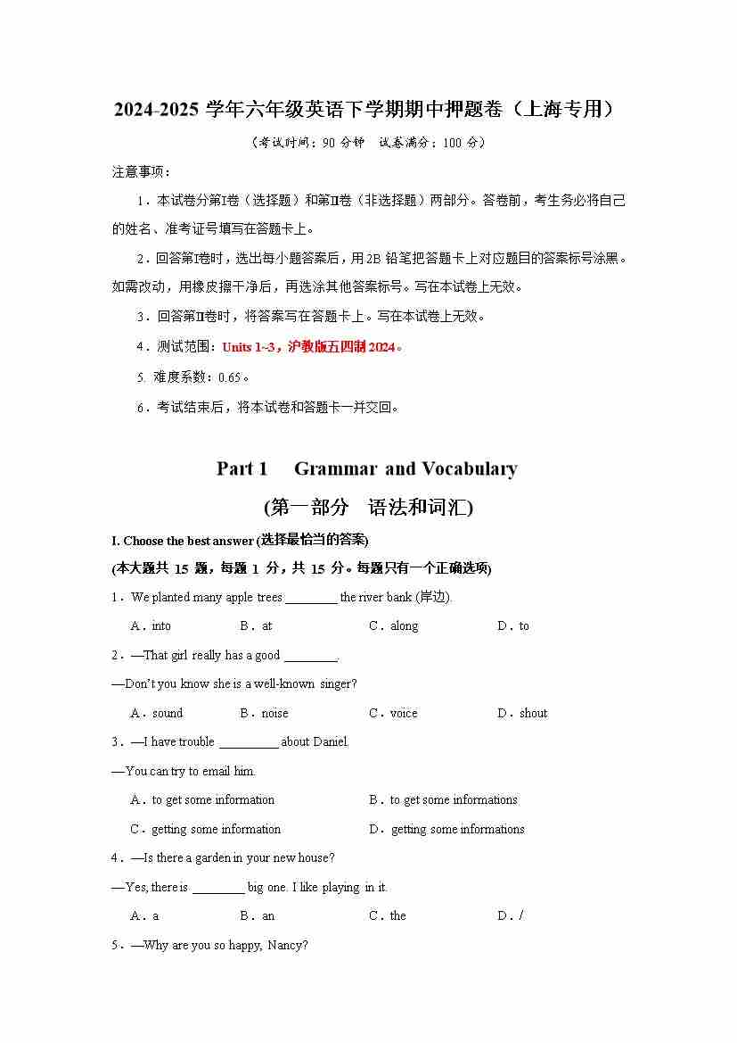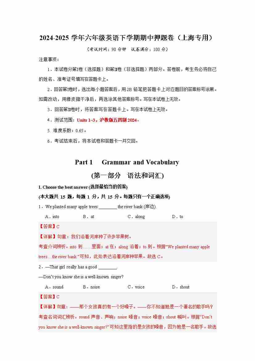 六年级英语下学期期中押题卷(上海专用)(学生版)