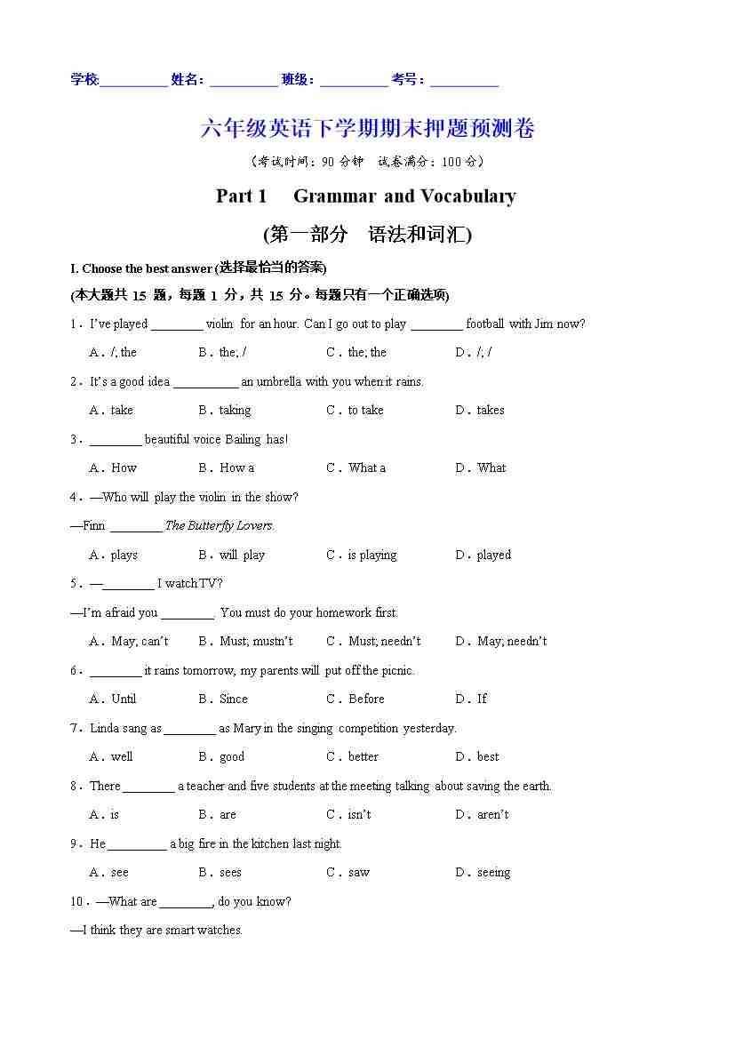 六年级英语下学期期末押题预测卷(上海专用)(学生版)