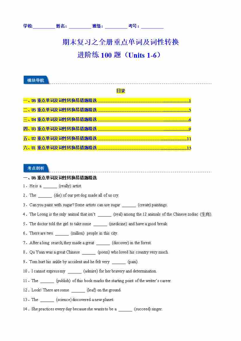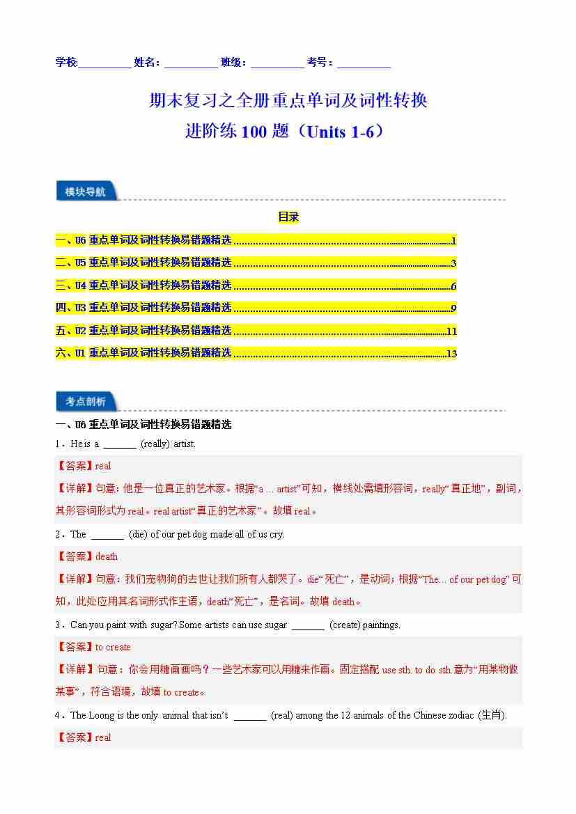 期末复习之全册重点单词及词性转换进阶练100题(Units 1-6)(教师版)