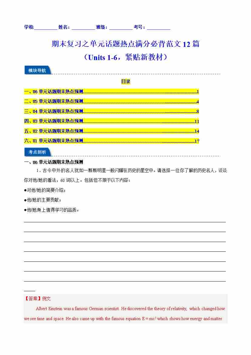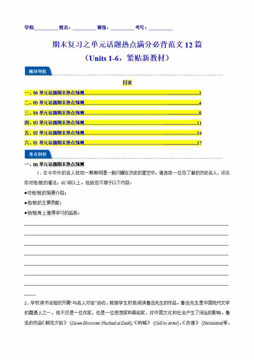 期末复习之单元话题热点满分必背范文12篇(Units 1-6,紧贴新教材)(教师版)