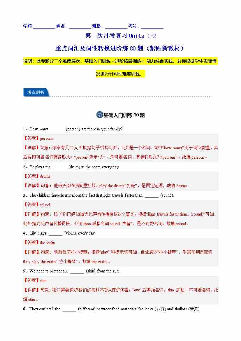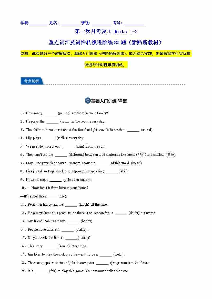 第一次月考复习Units 1-2 重点词汇及词性转换进阶练80题(紧贴新教材)(教师版)