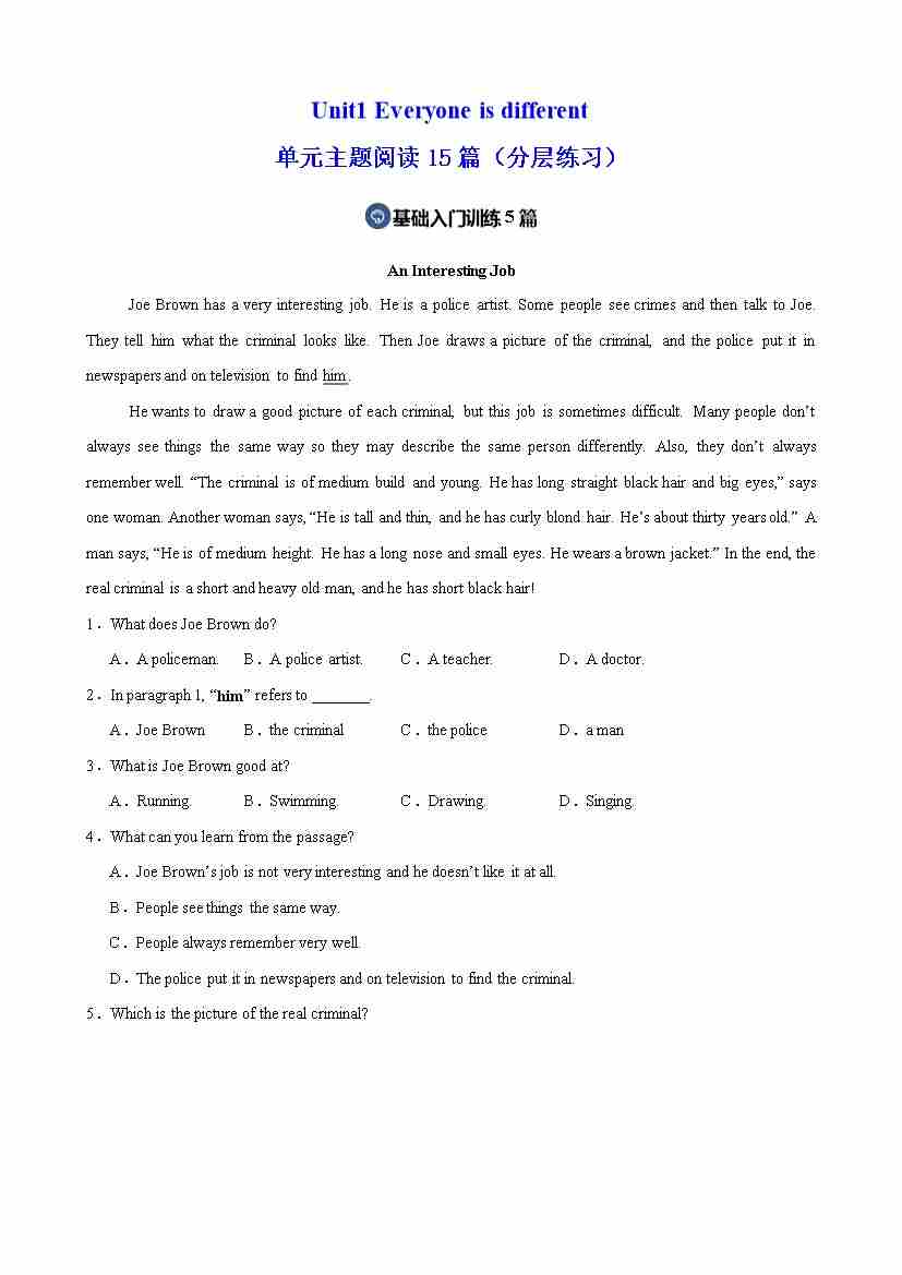 Unit1 Everyone is different 单元主题阅读15篇(分层练习)(原卷版)