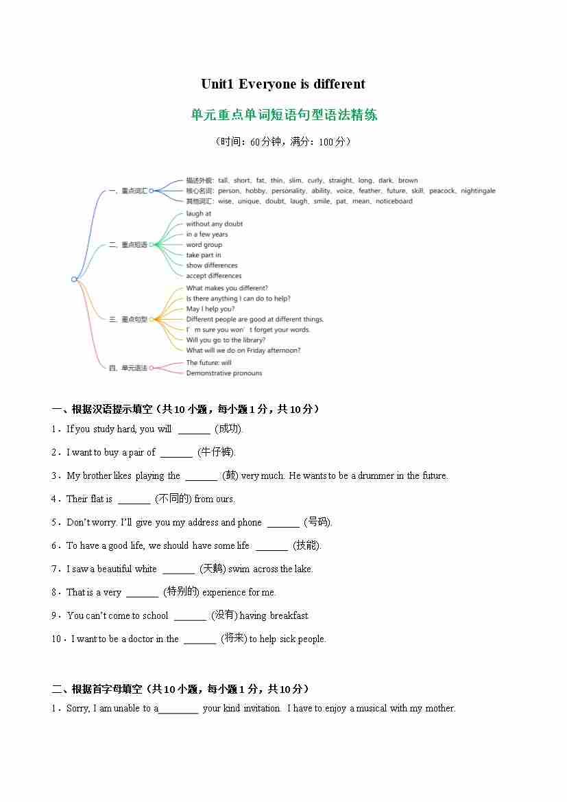 Unit1 Everyone is different 单词短语句型语法(教材考点精练)(原卷版)