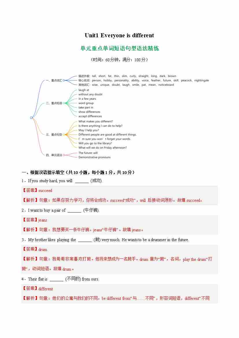 Unit1 Everyone is different 单词短语句型语法(教材考点精练)(解析版)