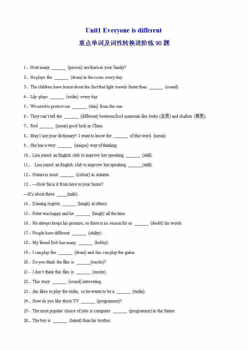 Unit1 Everyone is different 重点单词及词性转换进阶练90题(分层练习)(原卷版)