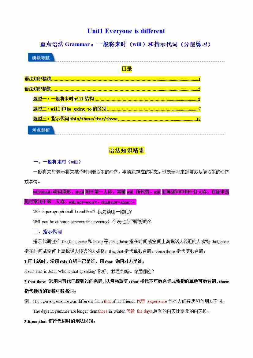 Unit1 Everyone is different 重点语法Grammar:一般将来时(will)和指示代词(分层练习)(解析版)