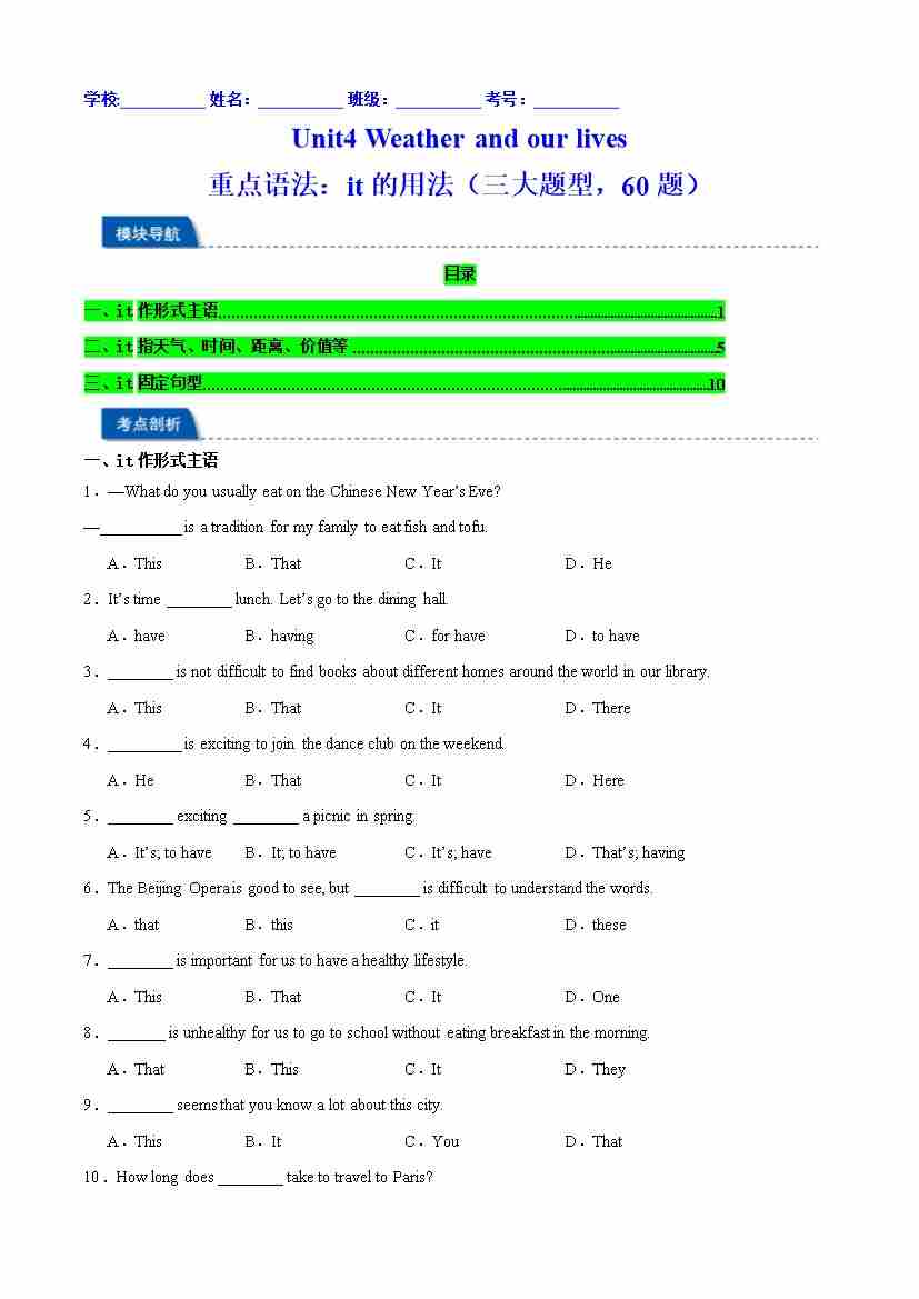 Unit4 Weather and our lives 重点语法:it的用法(三大题型,60题)(原卷版)