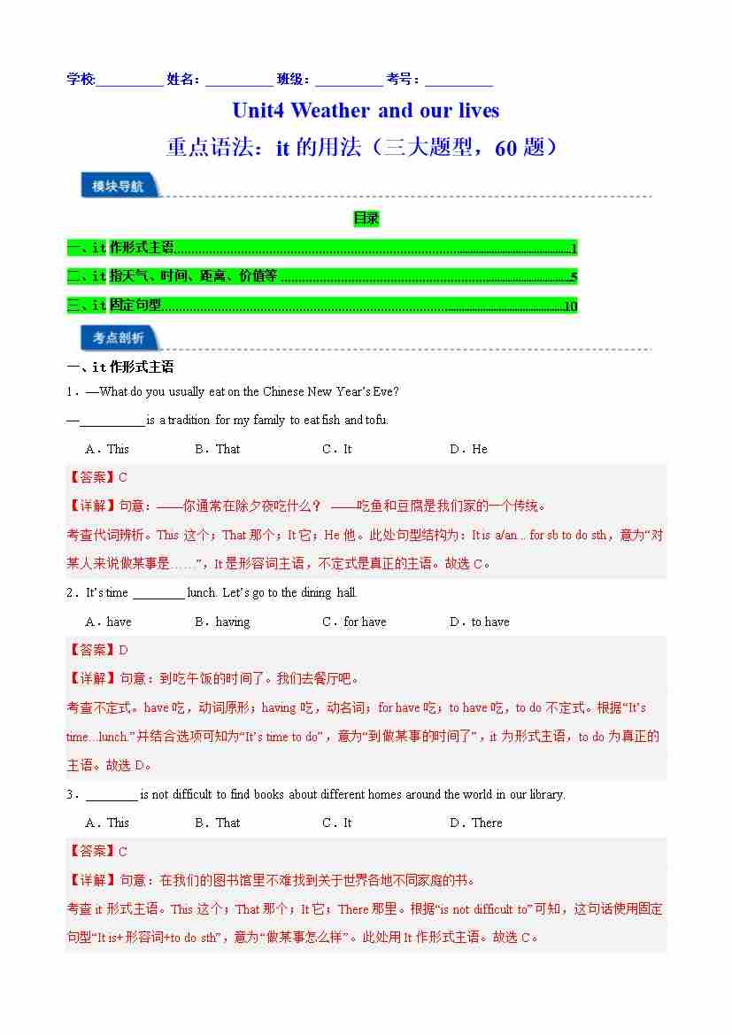 Unit4 Weather and our lives 重点语法:it的用法(三大题型,60题)(解析版)