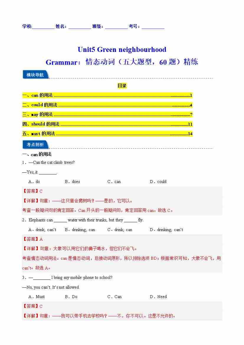 Unit5 Green neighbourhood Grammar:情态动词(五大题型,60题)精练(解析版)