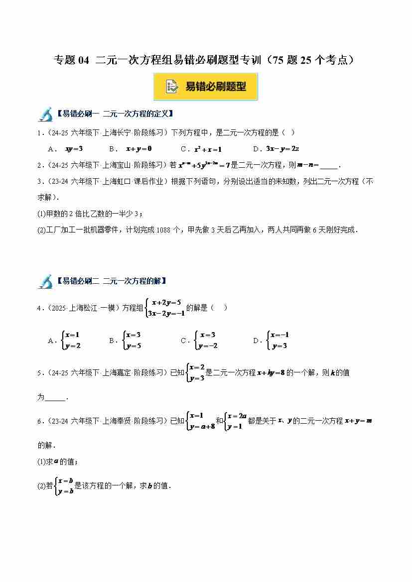 专题04 二元一次方程组易错必刷题型专训(75题25个考点)-(沪教版2024)(学生版)